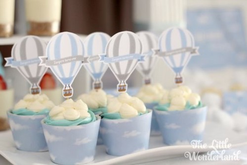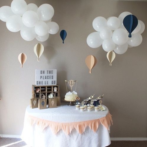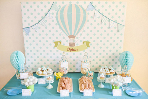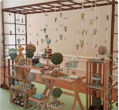 Balão de ar quente: acho super querido e enquadra-se muito bem para um primeiro aniversário. Não queria tudo matchy-matchy, portanto quebrei com elementos de madeira e coloquei folhas de videira até porque adoro flores e dei um toque subtil mas essencial.